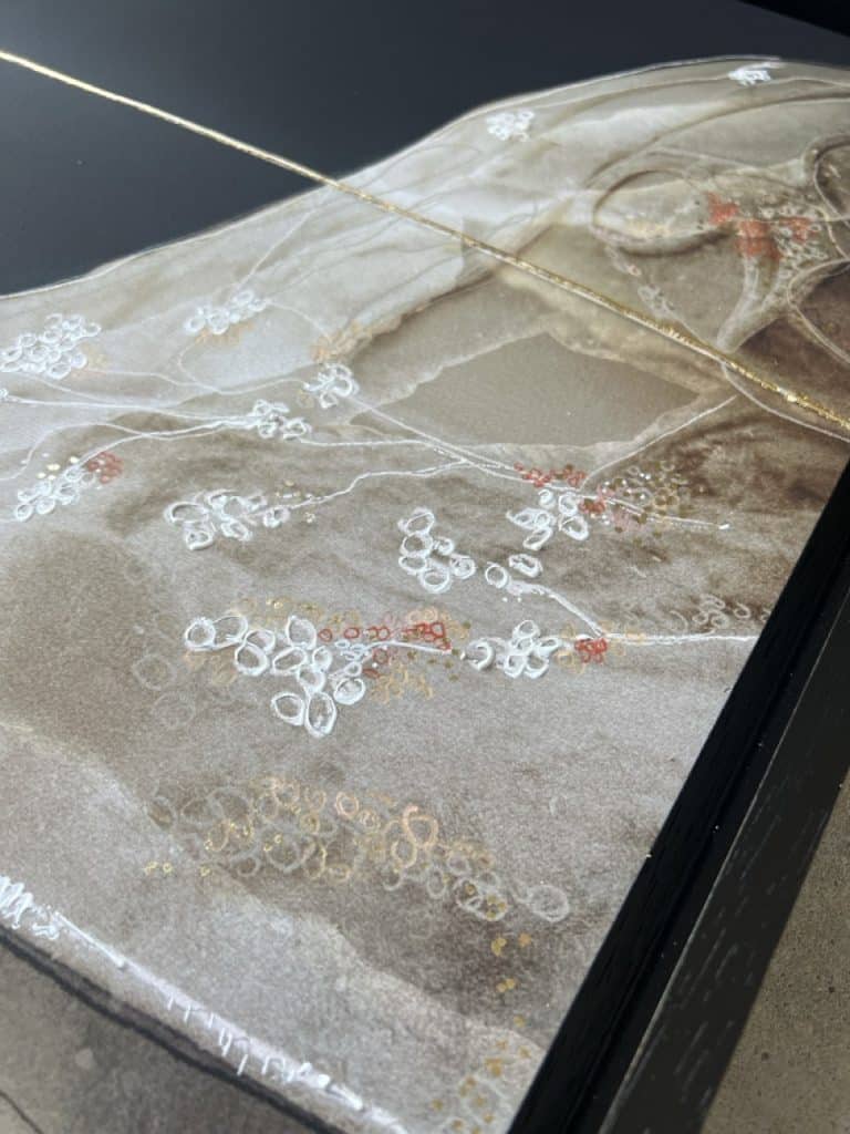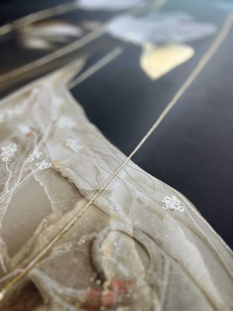 Technique: Acrylic ink/paint, UV print, fineliner, charcoal and gold leaf.