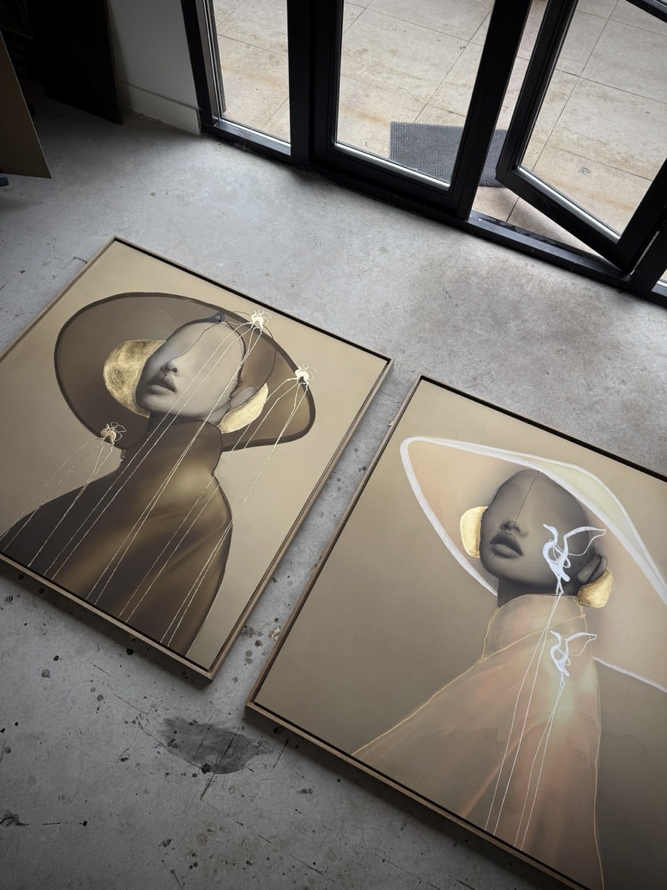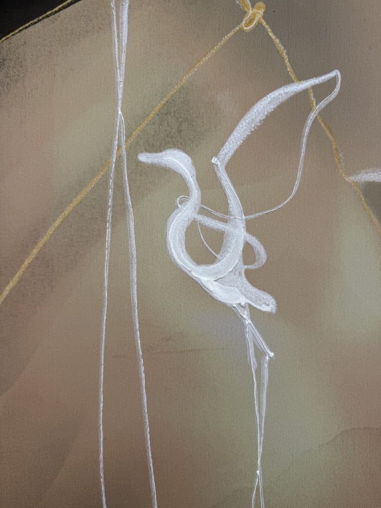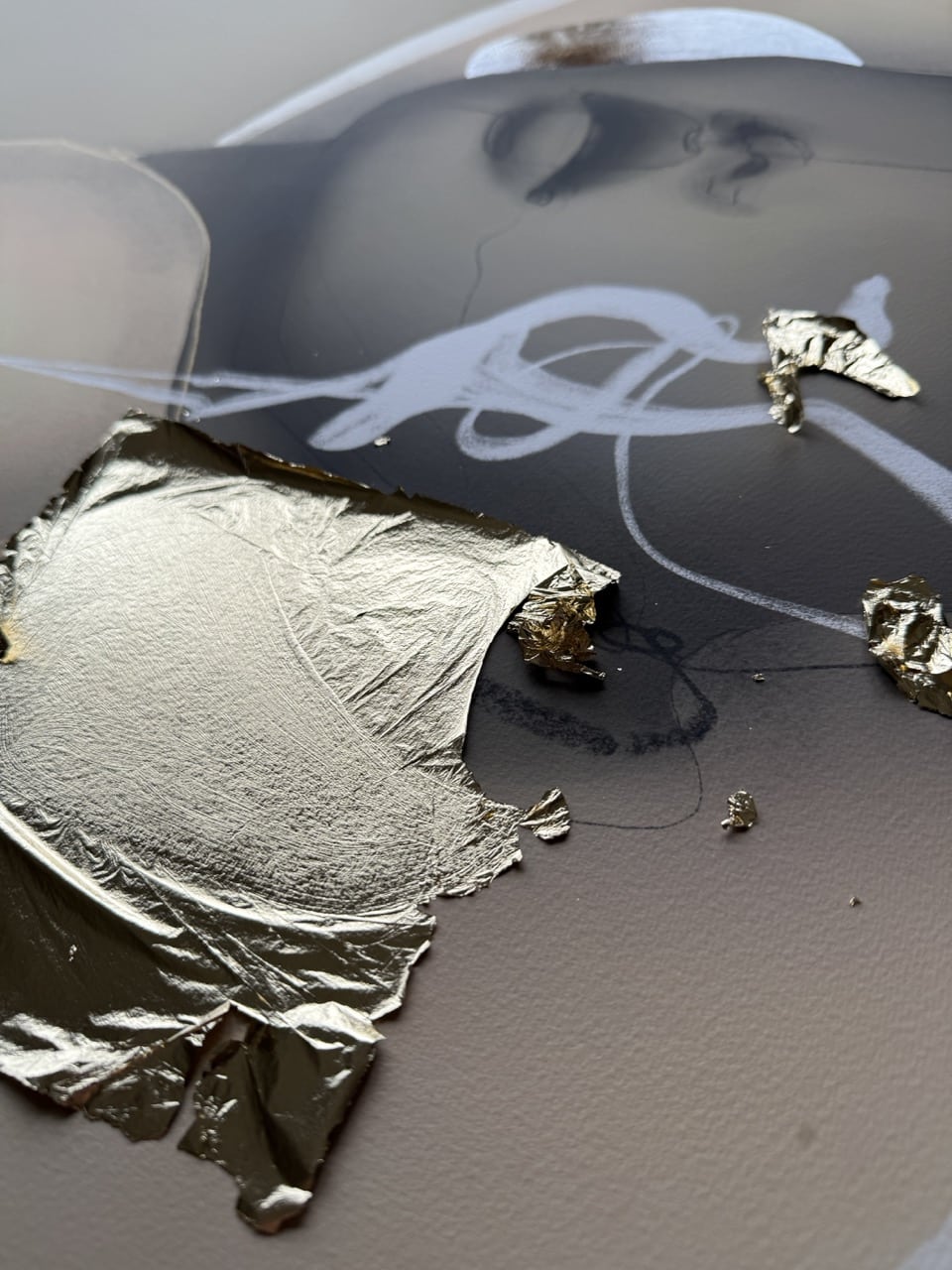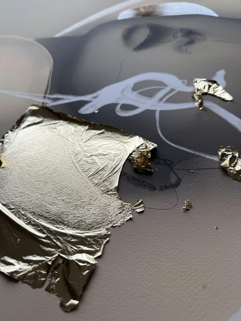 Technique: Acrylic ink/paint, UV print, fineliner, charcoal and gold leaf.