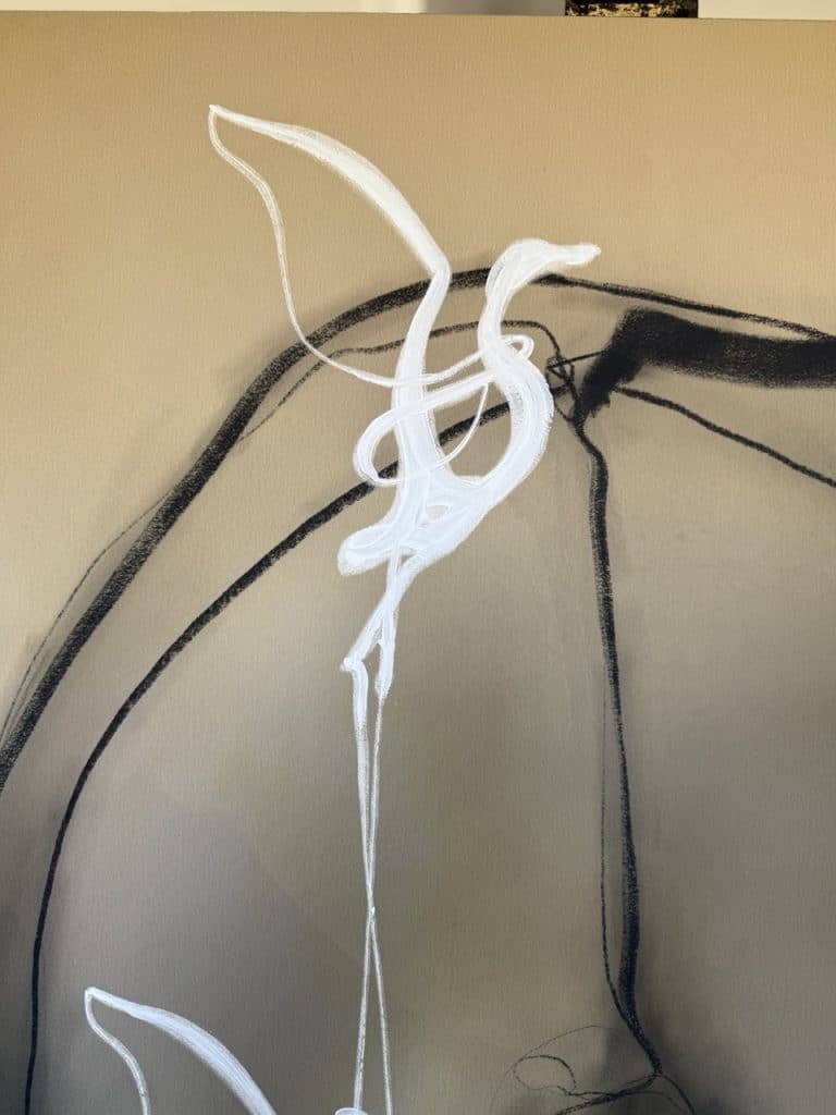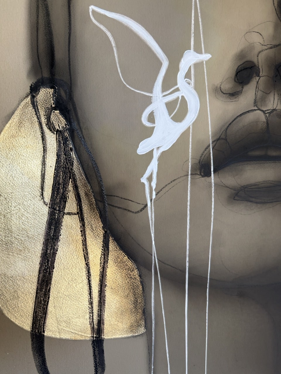 Technique: Acrylic ink/paint, UV print, fineliner, charcoal and gold leaf.